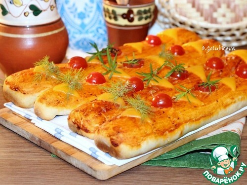 Я украсила верх пластинчатым сыром и помидорами черри.