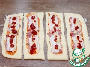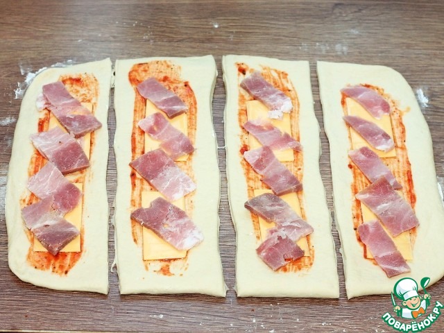 Раскатываем тесто до размеров 30*40 см и делим на 4 части (лепешки).