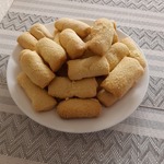 4. Тесто разделить на 2 части, каждую часть раскатать в колбаску и нарезать на кусочки. Кусочки обвалять в коричневом сахаре ( коричневый сахар можно заменить на белый или на измельчённые в муку орехи ).