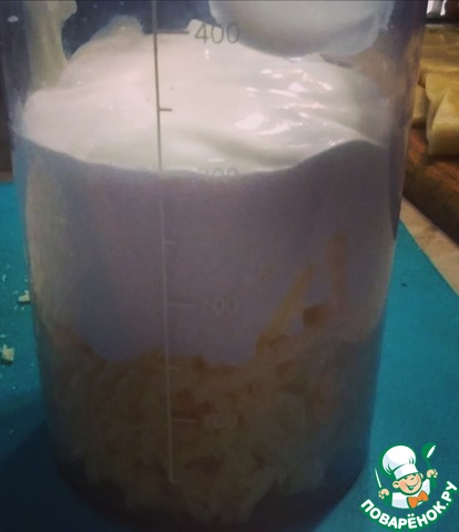 Оставшуюся сметану взбить с половиной натертого твердого сыра, добавить куркуму, посолить и залить соусом фаршированные каннеллони.
