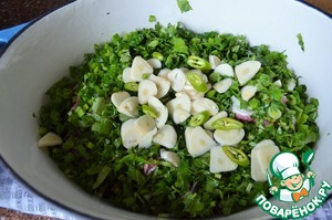 На мясо разложить рубленую зелень петрушки, кинзы и лук зелёный, слайсы чеснока и перец чили.