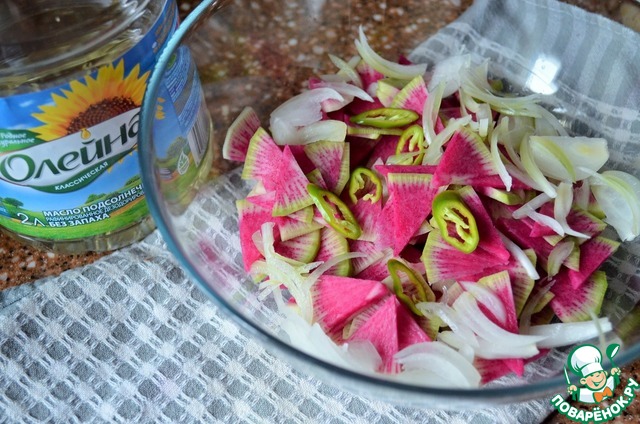 Дайкон вымыть, почистить, нарезать тонкими ломтиками, посолить и добавить сахар, перемешать.
