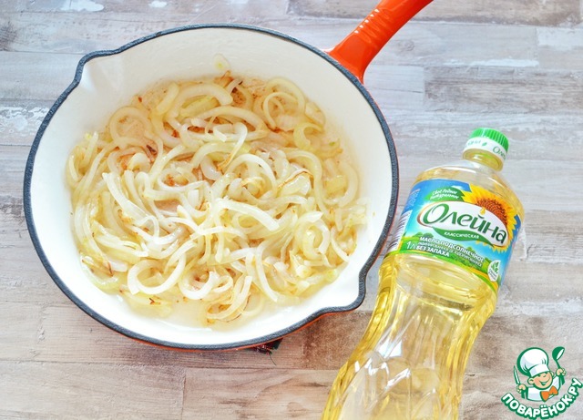 В сковороде разогрейте масло Олейна и слегка подрумяньте в нём нарезанный полукольцами репчатый лук (до лёгкого золотистого цвета)