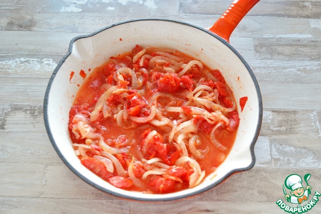 Добавьте к луку размятые вилкой томаты в собственном соку. Потушите томаты с луком около 5 минут, добавьте соль, сахар.