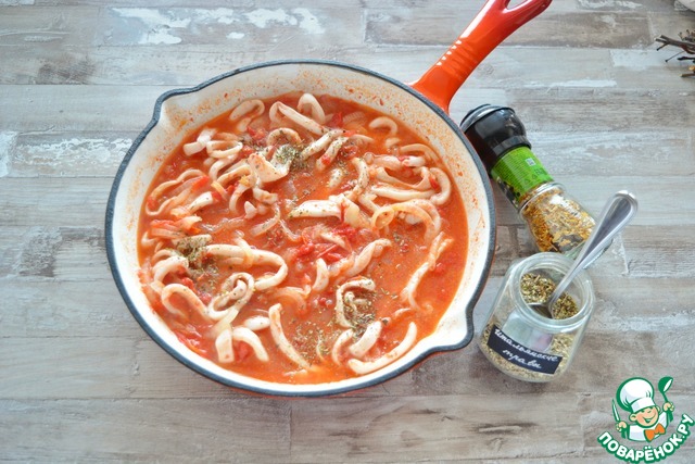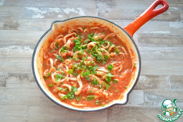 В этот получившийся томатный соус добавьте нарезанные кольцами кальмары и потушите всё вместе, пока кальмары из прозрачных не станут беловато-розовыми. Обычно на это уходит 2-3 минуты. Самое большое - это 5 минут. Главное не передержите, чтобы кальмары не стали резиновыми.