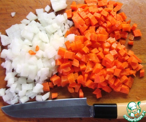 Нарезать лук и морковь. Разогреть на сковороде растительное масло и обжарить овощи до мягкости.