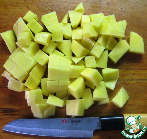Картофель нарезать кусочками и отправить вариться в кастрюльку с бульоном.