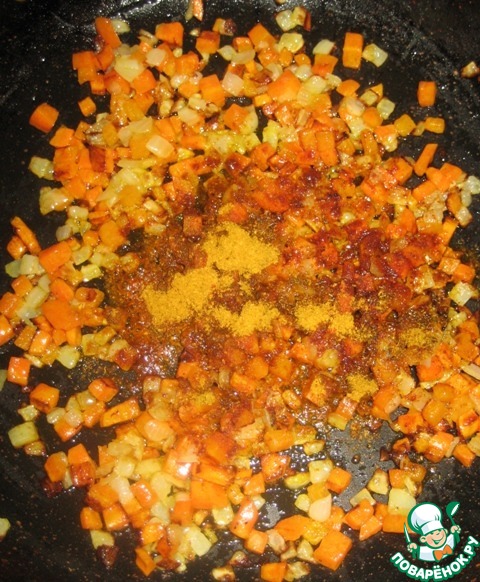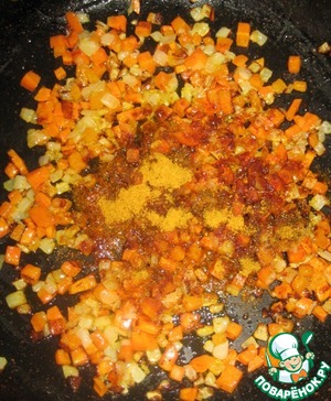 Когда морковь станет мягкой, добавить карри и паприку. Перемешать и снять сковороду с огня.