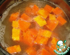 Когда бульон с картофелем закипит, убавить огонь под кастрюлькой, варить 4-5 минут. Затем добавить кусочки тыквы.