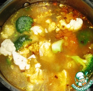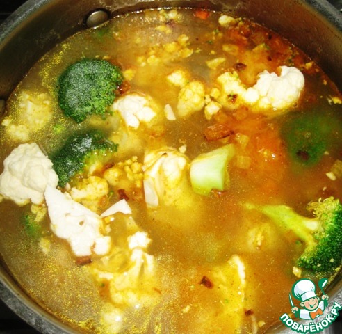 Когда картофель уже практически будет готов - добавить в кастрюльку луково-морковную зажарку и разобранные на соцветия брокколи и цветную капусту.