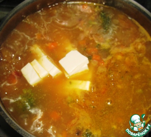 Как только соцветия будут готовы - добавить кусочки сливочного плавленого сыра, тщательно перемешать, давая сыру расплавиться, снова дать закипеть супу и снять с огня.