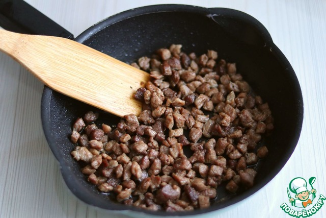 Свинину (200 гр.) нарезать мелкими кубиками, примерно 1см. - 1,5см. На сковороду добавить 3 ст. ложки растительного масла ТМ "Олейна" классическое, потушить/обжарить кусочки свинины до готовности, добавить по вкусу соль и черный молотый перец.