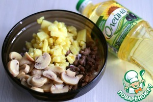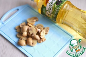 Маринованные шампиньоны нарезать кусочками/пластиками. Если грибы мелкие, можно их не резать.