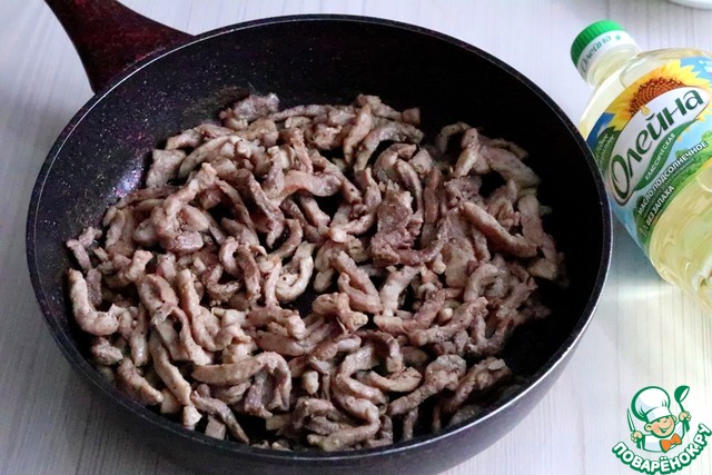 • Не жирную свинину, слегка подмороженную, нарезать тонкой соломкой, примерно 0,5-0,7 см. На сковороду добавить 5 ст. ложек растительного масла ТМ "Олейна" классическая. Обжарить мясо на интнсивном огне до легкой золотистой корочки. Добавить по вкусу соль и черный молотый перец.