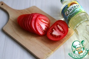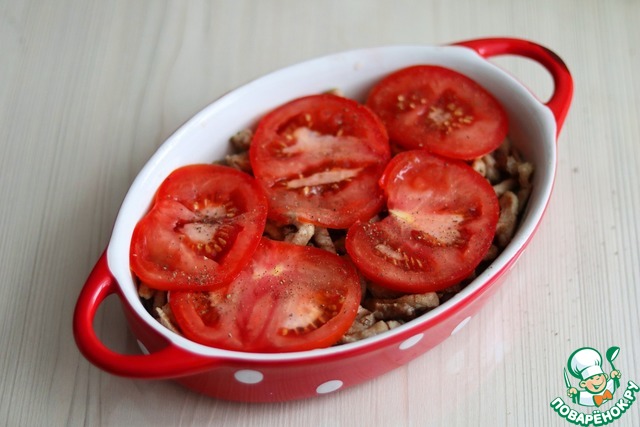 • Далее выложить на мясо пластики помидоров. Помидоры присолить и поперчить по вкусу.