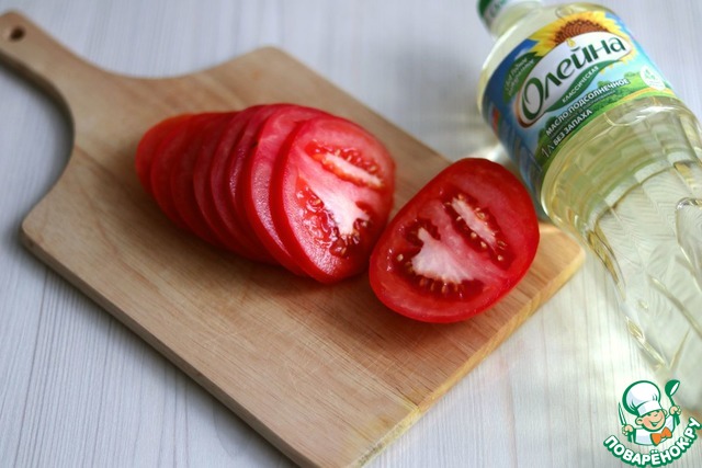 Далее выложить на мясо пластики помидоров. Помидоры присолить и поперчить по вкусу.