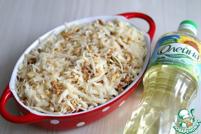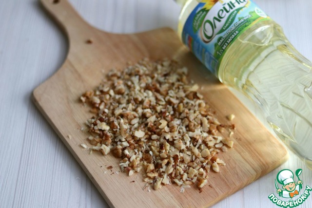 Грецкие орехи (3 горст.) хорошо промыть. Нарезать не крупными кусочками или пробить слегка блендером в не крупную крошку.