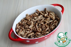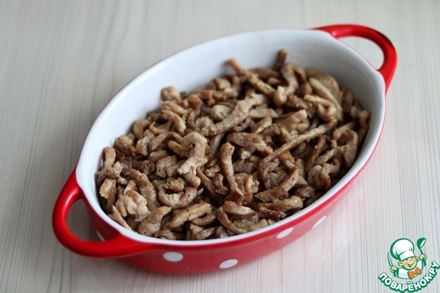 • На дно формы для запекания добавить 1 ст ложку растительного масла, выложить обжаренную свинину.