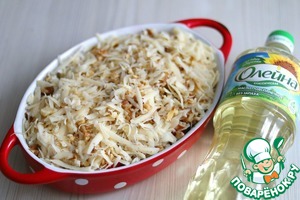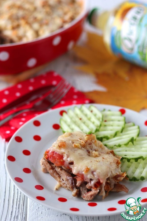 На дно формы для запекания добавить 1 ст ложку растительного масла, выложить обжаренную свинину.