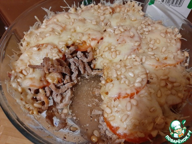 Достойное богатое блюдо получилось. Не люблю грецкие - добавила кедровые орешки, они более ароматные. И сыр пармезан. Вкусно, но всё разваливается. Чем-то надо мясо скреплять (может сметана с мукой или яйцом). На фото видно, накладывали ложкой. Мясо суховато, даже помидоры не спасли.