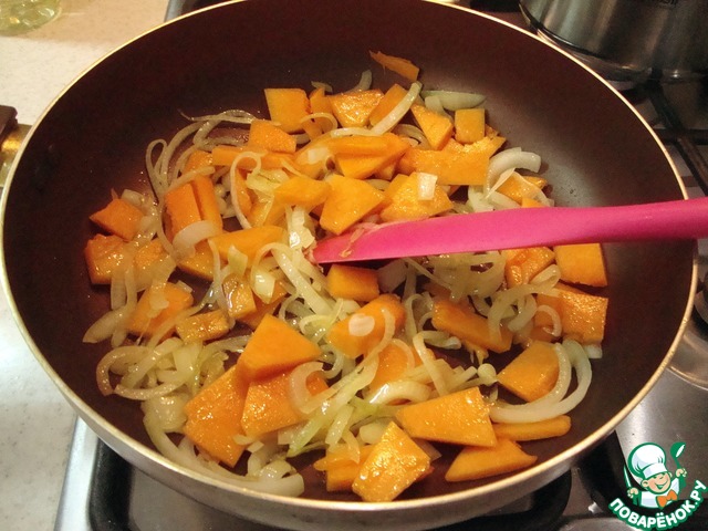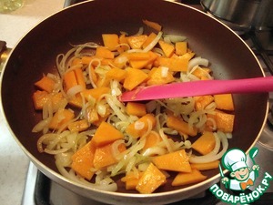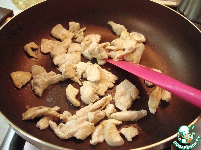 В отдельной сковороде ( или убрать с этой лук с тыквой) обжарить до побеления куриную грудку. Если масла мало осталось, то можно добавить ложки 2 воды и слегка протушить. Я так и сделала.