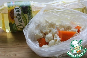 Влить в пакет растительное масло ТМ Олейна, добавить тмин, паприку, соль, куркуму и перец.
