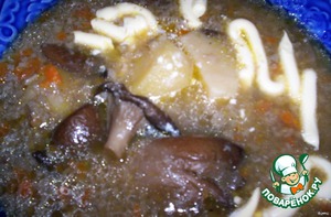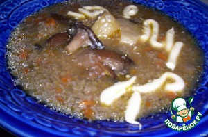 - 2 /3 грибов измельчить в блендере , добавить в кипящий мясной бульон , варить 15 минут