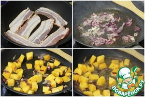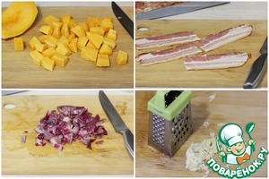 Тыкву нарезать на кубики, лук мелко нарезать, чеснок натереть на терке, полоски бекона оставить целыми или разрезать на половинки.