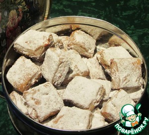 • После того как печенье остынет полностью, снова обсыпать его сахарной пудрой и аккуратно переложить в контейнер или в металлическую банку с крышкой.