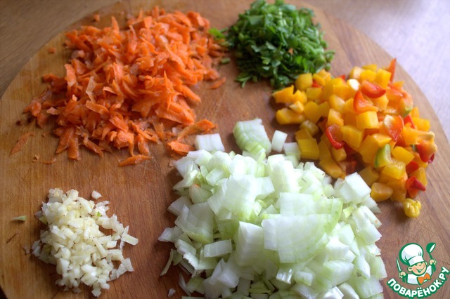 Морковь натереть. Остальные овощи и зелень измельчить. Если есть, нарезать стебель сельдерея.