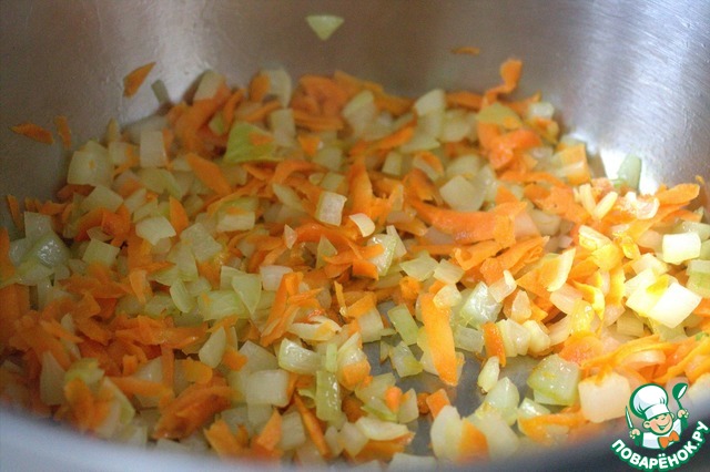 В кастрюле с толстым дном прогреть лук и морковь на растительном масле.
