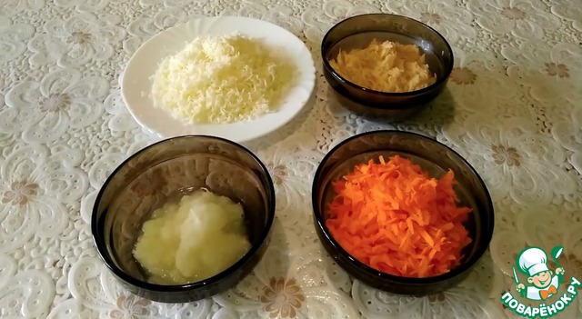 2. Лук, картофель и сыр натираем на мелкую терку, морковь на крупную терку.