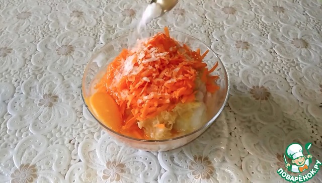 3. Добавляем натертые овощи к фаршу, одно яйцо, чайную ложку соли и перец по вкусу и перемешиваем до однородности.