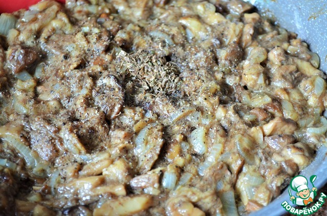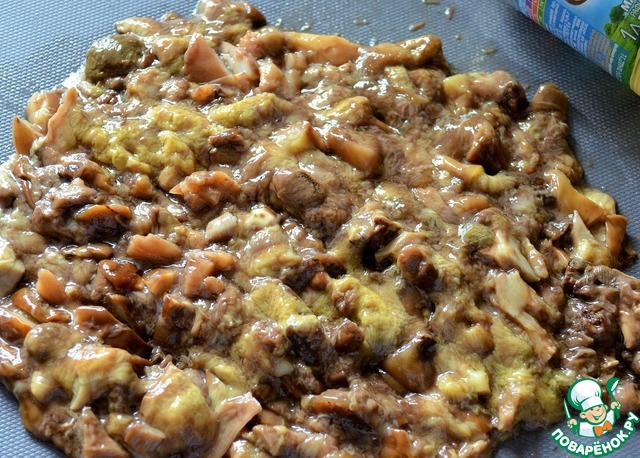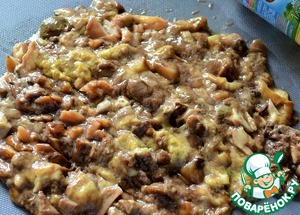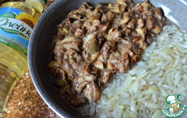 Заранее отварить лесные грибы, отцедить от жидкости, порубить.