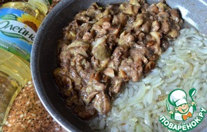 В сковороде разогреть растительное масло. Лук порезать четверть кольцом и обжарить, добавить грибы.