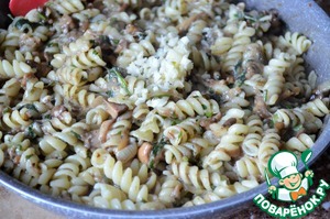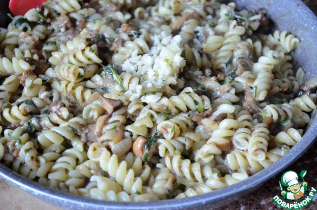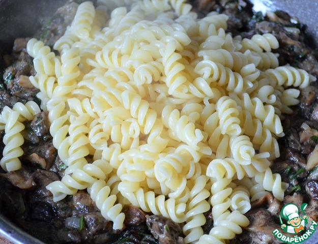 К грибам добавить макароны, влить 50 мл. кипятка или грибного отвара, посолить по вкусу, перемешать, жарить 3 минуты.