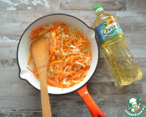 Разогрейте в сковороде 3 ст. л. масла "Олейна". Слегка поджарьте на масле нарезанные соломкой лук и морковь