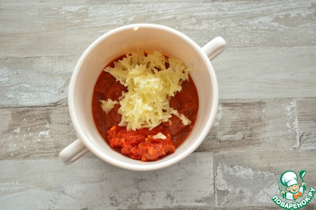 За 10 минут до готовности добавьте в блюдо смесь кетчупа, острого перца и измельченного чеснока, перемешайте.