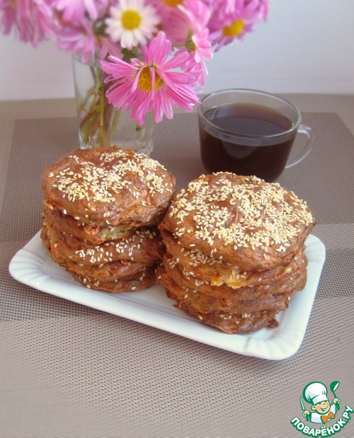 Мокрыми руками сформировать шарики (у меня получилось 11 шт.). Чуть расплющить их на противне, укладывая их на достаточном расстоянии (лепешки в процессе выпечки станут тонкими и увеличатся в диаметре). Присыпать сверху кунжутом и отправить выпекаться в разогретую до 180 духовку на 30-35 минут до румяного цвета.