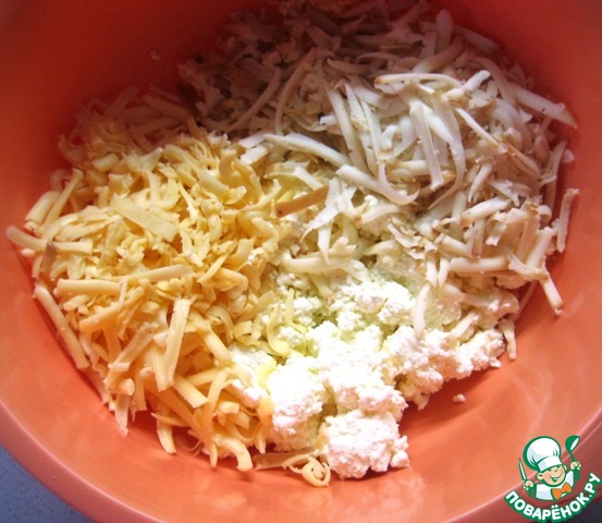 В миске соединить творог, натертый твердый сыр и копченый сулугуни.