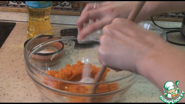 Тыкву запечь или отварить на пару. В воде лучше не варить, т к тыква даст много жидкости. Помять готовую тыкву вилкой или измельчить блендером.