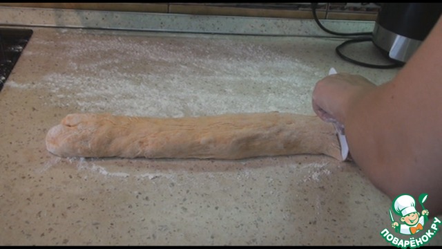 У меня тесто стояло 40 минут, потом достаём его, немного обомнём, сделаем колбаску и нарежем на равные кусочки.