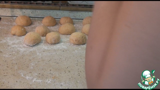 Из кусочков теста сформируем шарики, выложим на присыпанный мукой стол, накроем полотенцем и оставим на 15-20 минут для подъёма. Можно сразу выкладывать на противень, застеленный пергаментом.