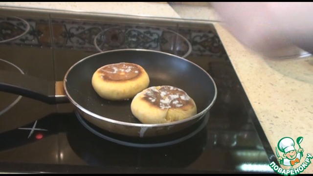 Я оставила две булочки чтобы пожарить. Для этого проделала такие же манипуляции с маслом и кунжутом, потом выкладываю булочки на разогретую на небольшом огне сковороду. Сковороду ничем не смазываю, накрываю крышкой и жарю с одной стороны 5-7 минут.