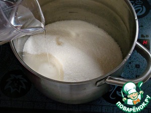 Затем сварить сироп. Для этого в кастрюле смешать воду и сахар, довести до кипения и прокипятить до полного растворения сахара.