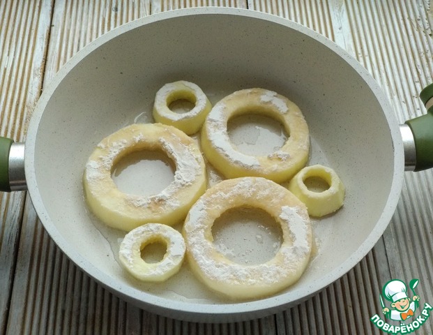 Переложить на сковороду, смазанную оливковым маслом. Ещё я положила в сковороду колечки от маленького кабачка (оставался кусочек :)), в ингредиентах не указывала.