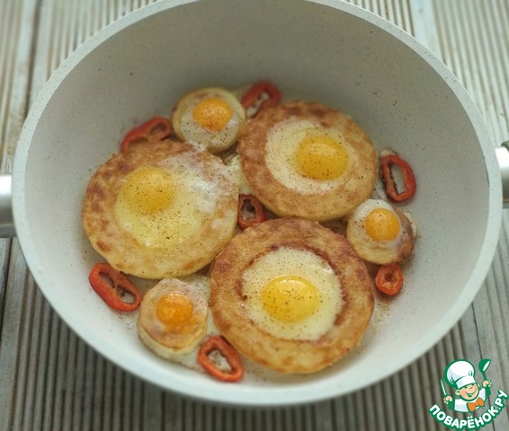 Вбить яйца в колечки (в маленьких кружочках у меня перепелиные яйца). Посолить (2 щеп.) и посыпать паприкой. Накрыть крышкой, довести до готовности на медленном огне.