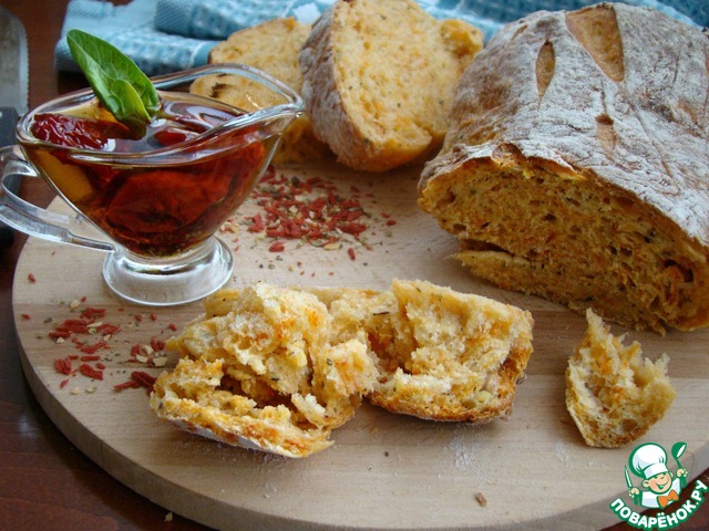 [+5]У меня "наполнитель" из сушеных томатов с травками... томаты в процессе выпечки, придали мякишу красивый оттенок.