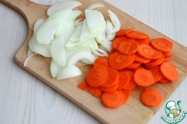 Репчатый лук (1 шт.), морковь (1 шт.) нарезать кружочками, лук полукольцами.