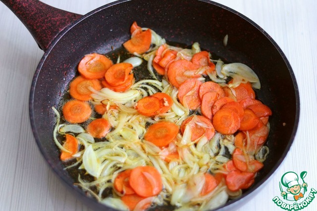 Пассеровать лук и морковь до легкой золотистой корочки.